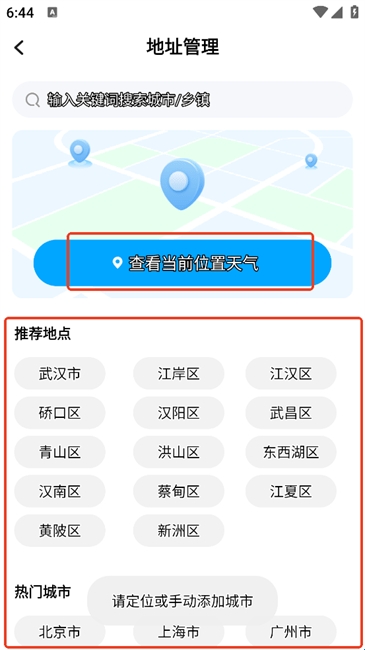 1、进入软件后可手动选择城市地点或是采用自动定位来匹配城市