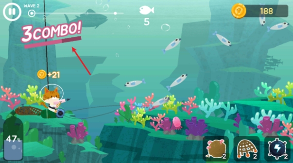 4、连续补中鱼后会获得连击,连击达10次以上可以获得%50能力加强。