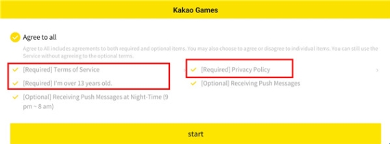 2、进入后是权限服务选择,显示了【Required】的也就是红框中的都是必填选项,分别是游戏须知、年龄和服务条款,其他两个分别是消息推送和游戏通知,选择好后就可以进入游戏开始体验。