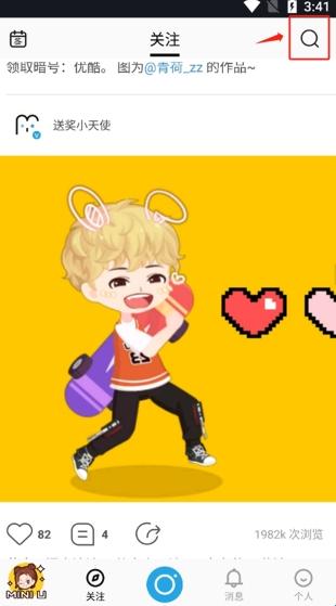 1、你可以主动邀请好友,在广场页点击右上角“搜索”键。