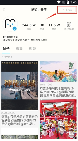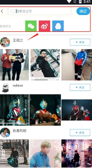 3、当然你也可以在足记结交好友,在广场页发现好看的图片和用户,可以点击头像旁的“关注”或“+”进行关注。