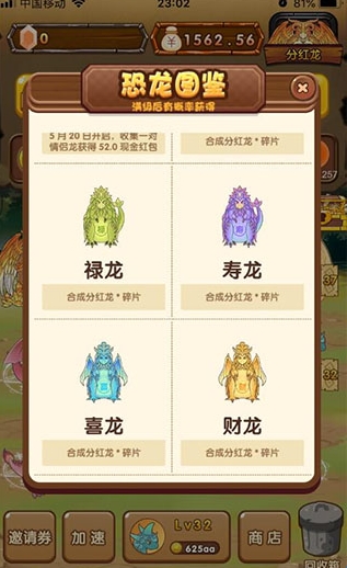 要合成分红龙需要把恐龙养大,养大需要金币。之前金币不够只能用邀请券来兑换,由于邀请券要邀请下线才能获得,所以龙增长比较缓慢。APP更新后,金币不足,可以通过看视频来获得了。每天晚上20:00更新看视频的机会,一共可以看10次视频,得10次金币来合成恐龙。