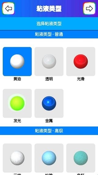 3、选择好之后,切换上方箭头进行下一级,在这里展示里年粘液类型,有黄油、透明、光滑、发光、金属,在高级粘液类型中,有云状、松脆、鱼缸、毛茸茸、闪闪发光、全息等等。
