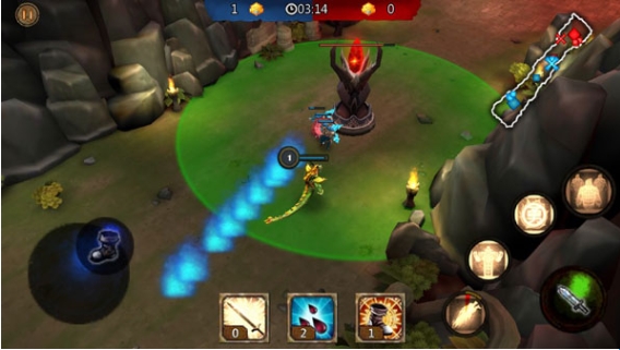 在游戏中玩家一共可以控制三个不同的英雄,通过左下角的英雄头像图标可以实现快速的切换控制。而右侧则是每个英雄的技能快捷按键,一共有四个,直接点击就能触发技能,直接发动或者需要手动选择释放位置。技能使用会有冷却时间,在技能快捷栏图标的下方会显示冷却时间,另外底端中间是各种道具的快捷栏,买了道具之后就能在这里点击使用。