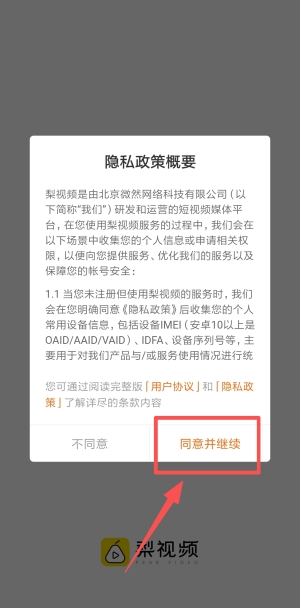 1、启动梨视频应用,确认隐私政策概要后进入。