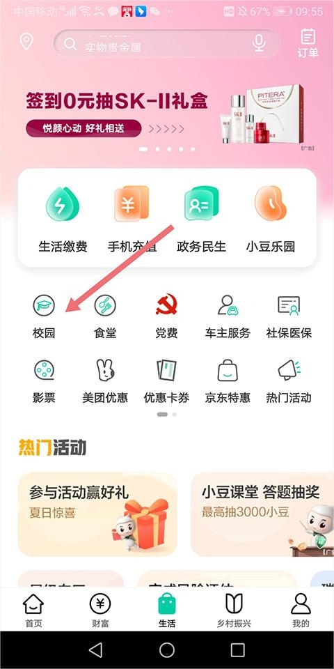 1、首先用户先按照上述方式进行注册、登录并激活农行掌上银行,然后进入应用的生活页面中点击【校园】