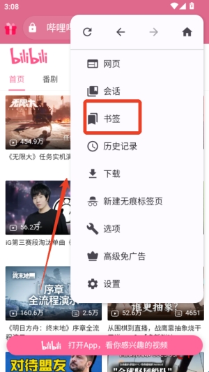2、浏览网页时遇到喜欢的页面,点右上角三个点再选书签,就能收藏网址,方便以后一键重新打开继续查看。