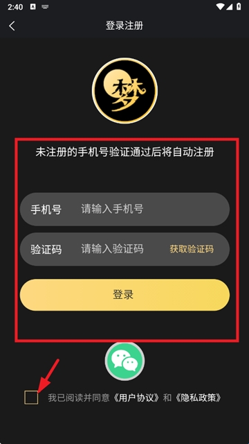 3、输入手机号和验证码,勾选用户协议和隐私政策