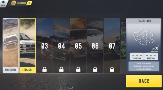2、点击play后可以选择想要驾驶的车辆,选好车辆后点击race选择挑战的关卡。