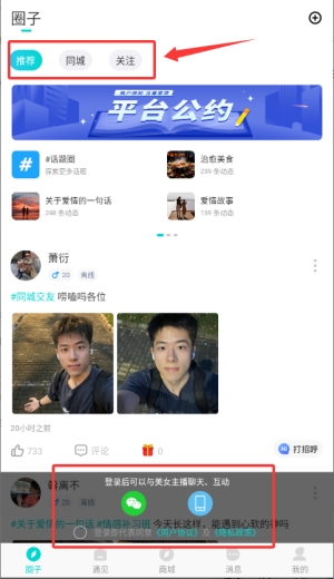 2、进入圈子界面可选择登录或通过推荐和同城等标签浏览动态。