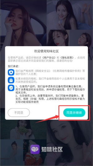 1、启动知味社区应用,先在欢迎页面点击同意并继续选项。