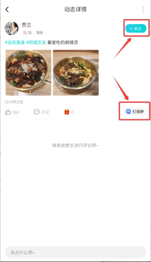 3、选择感兴趣动态可关注作者或发送打招呼消息。