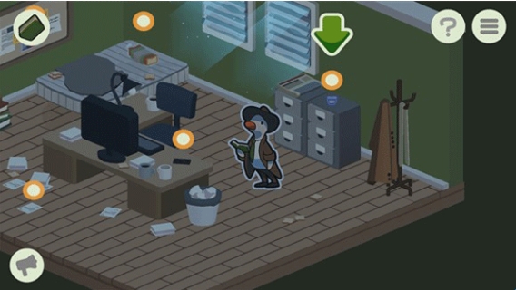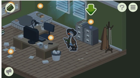 2、点击屏幕即可控制鸭子侦探移动,当场景中出现黄色圆圈时,点击它们即可搜寻关键线索;