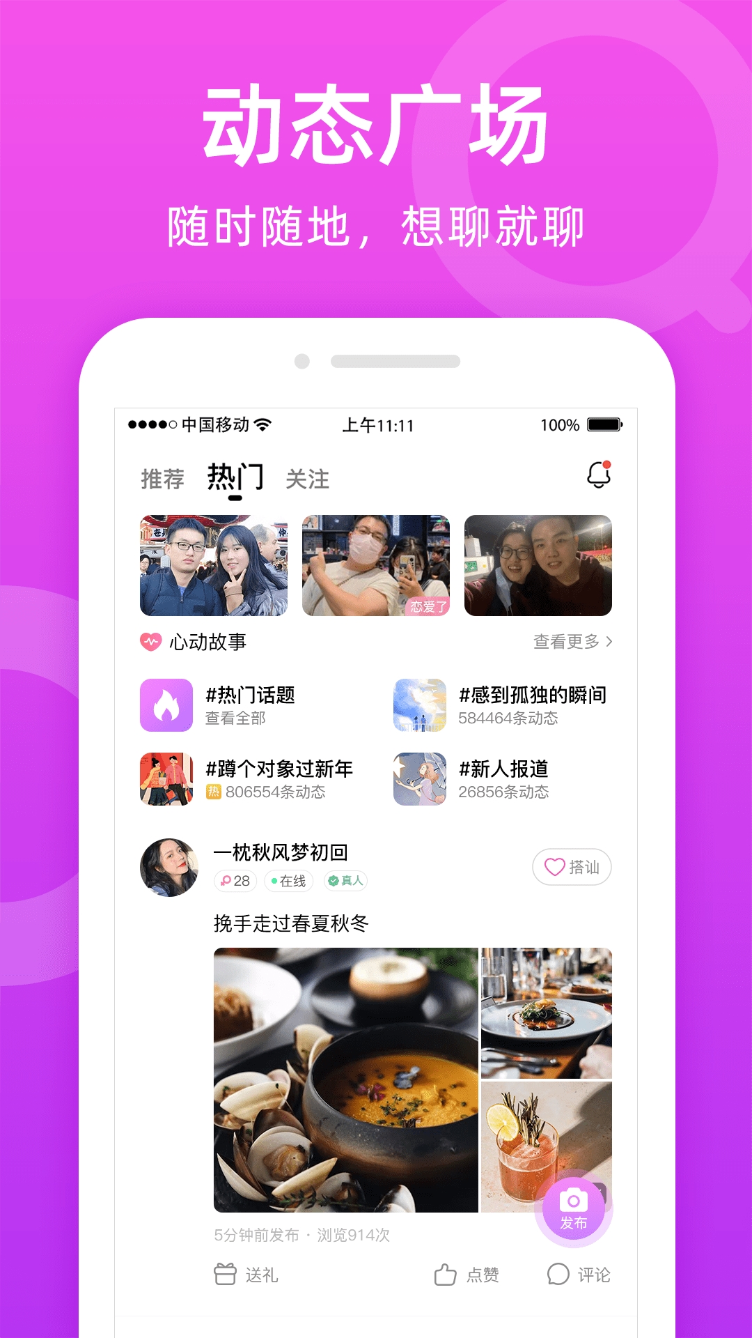 3、结合动态广场的内容分享与一对一的实时沟通,兼顾“展示自我”与“深度交流”,满足不同社交偏好。