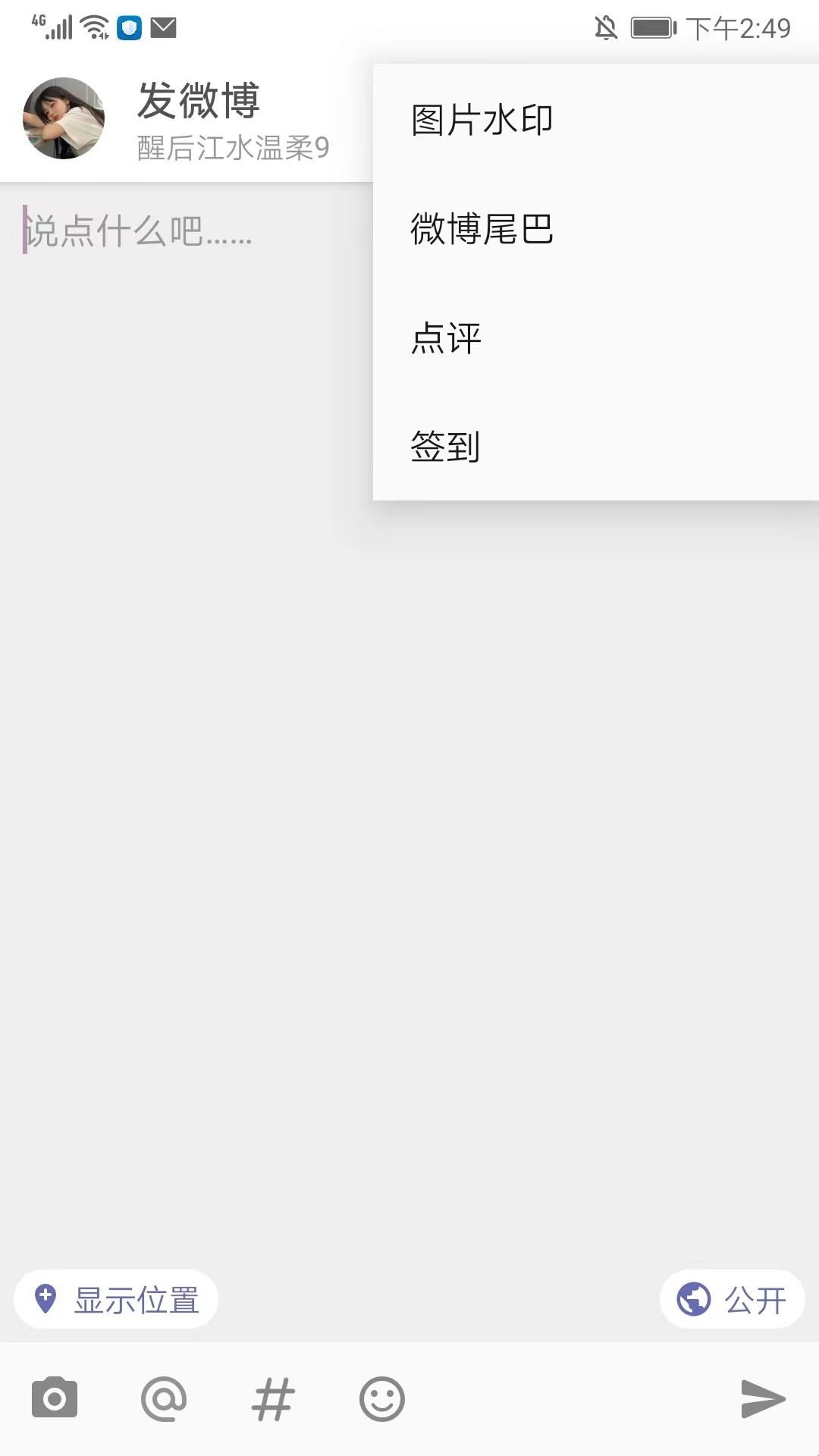 3、可看到包括图片水印、微博尾巴、点评和签到选项,我们点击【微博微博】选项,