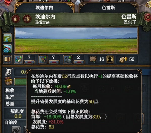 税收作为国家财政的基石,其数额与各省的行政发展度密切相关。行政点数通常被优先用于核心化领土,因此税收收入增长较为缓慢,更多依赖国土的自然扩张。它构成财政中相对固定的部分,无需频繁调整,属于稳健但不易大幅提升的收入来源。