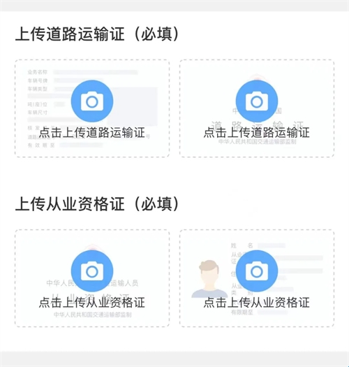 5、上传道路运输证、从业资格证如果是非黄牌、非营运车辆是不需道路运输证和从业资格证。其他类的黄牌车必须要上传。半挂车是需要车头和挂的营运证。