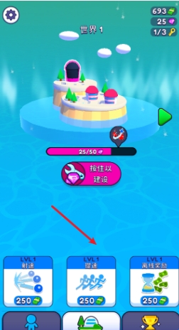 1、闯过更多的关卡来收集货币,升级你的射速、移动速度和离线奖励属性,帮助更好的体验游戏。