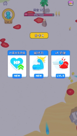2、消灭敌人后可以获得经验,提升自己的等级,升级后可以从三种强化卡牌中选择一张获得。