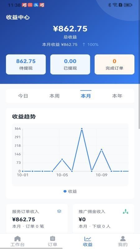 在收益中心中就可以查看自己的收益,掌握自己的收益趋势,轻松统计订单会受益。