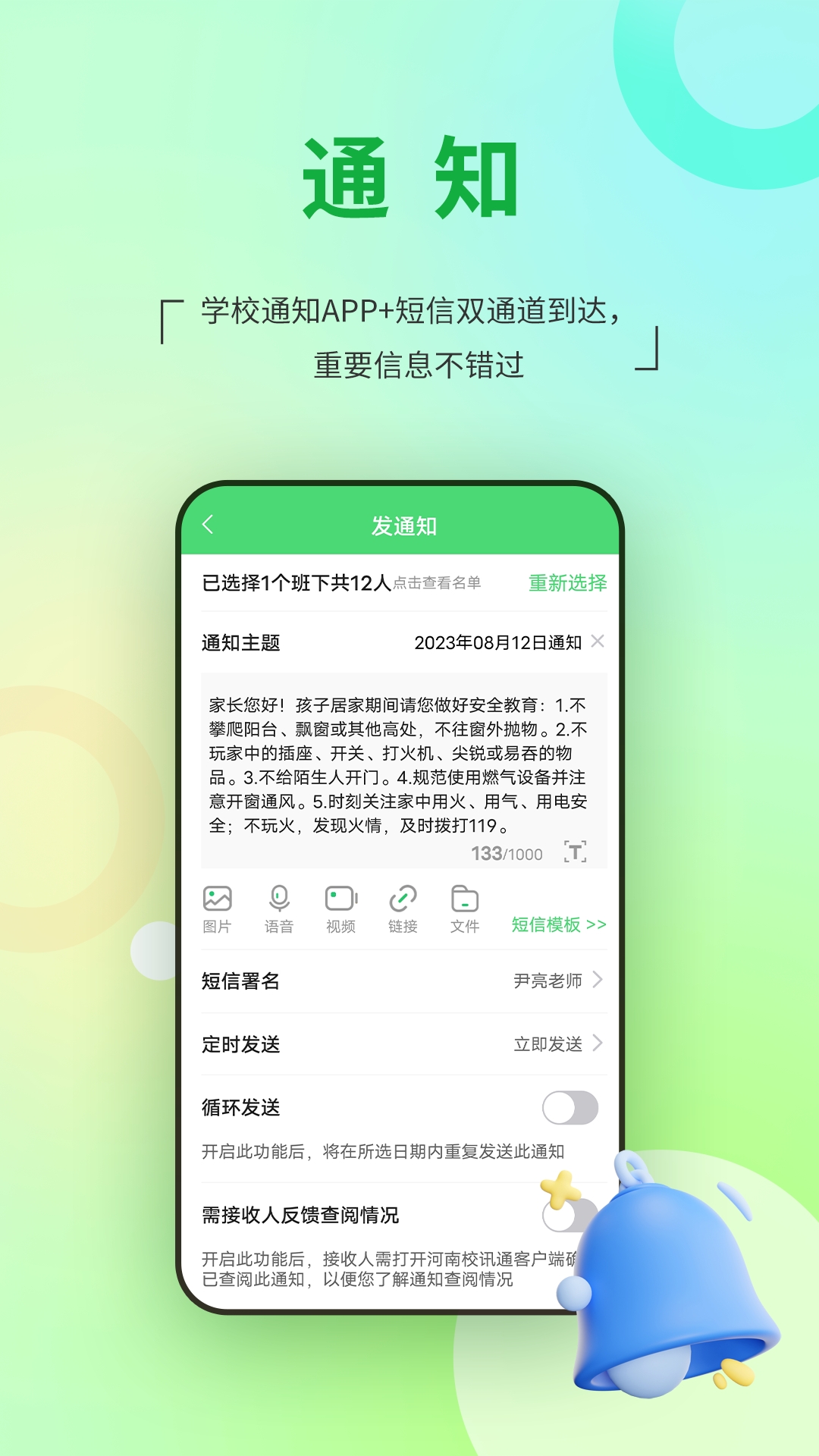 1、家校互动:基于通知、打卡、班级圈、成绩等功能,教师、家长随时随地在线互发短信或语音信息,沟通孩子学习情况,教师还可在线管理班级资料。