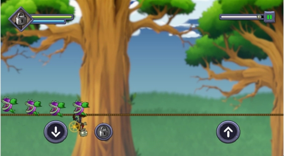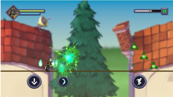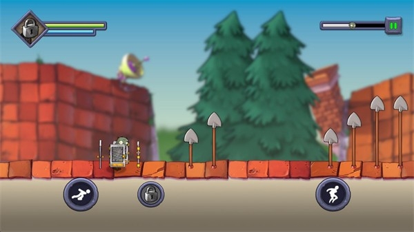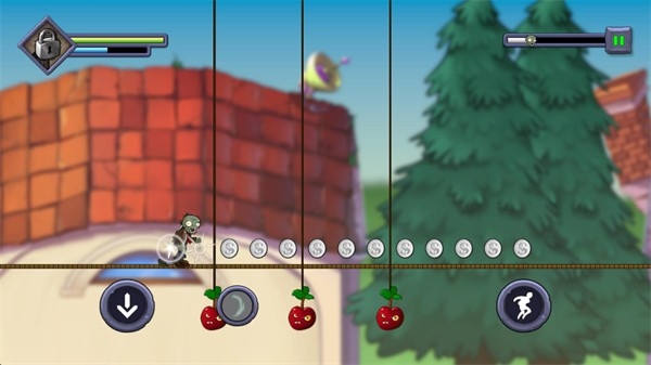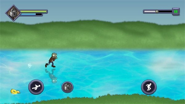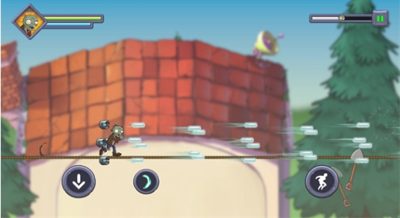 3、进入关卡后僵尸会自动前进,在屏幕左右的上下分别是跳跃和切换方向,有时向下的按键会变成冲刺。