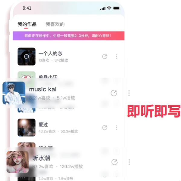 3、即听即写,我的作品,我喜欢的,歌曲正在创作中,生成一般需