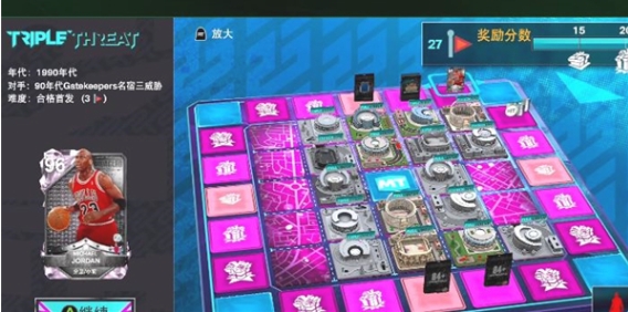 4、刷突破要先明确自己的需求,在确定是要刷MT币、紫徽章、还是球员卡后就可以选择对应的模式和传送门了。想要打出传送门就需要凑齐三个对应标签的门之后三连打,三连打后棋盘上四个角落会随机出现一个白色旋涡,然后把离白色漩涡图案最近的那个角落房间打了之后就会出现传送门。