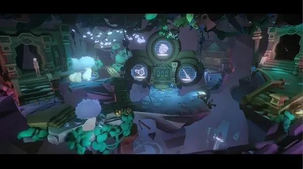 6、点击最下面的发光蘑菇,捡起地上的收集品。走过木桥,点击3个发光蘑菇,得到机关线索。然后走过最右边的小路,与机关互动,右边的九宫格点击左上角和右下角的方块,左边的九宫格点击中央和左下角的方块,使两边的水晶能量相连,捡起雕像手里的收集品。