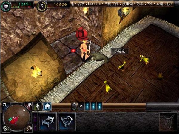 这一关主要是让玩家熟悉游戏的界面和操作,基本上没有难度,地城北面有大量黄金,传送门在东侧,建造5×3格的巢和3×3格的鸡舍后可招募到一定数量的大耳怪。当部队数量不再增加时,即可发动攻击。向北进发,途中有几个矮人,干掉他们后将来到英雄住处,本关英雄很弱,不用费什么劲就可将其杀掉。