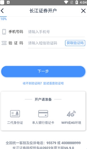 1、新用户需使用手机号进行登录,开户需准备二代身份证、本人银行借记卡、WIFI或4G环境。