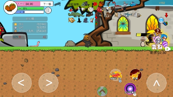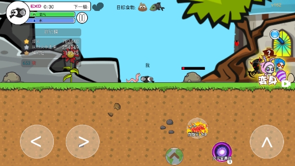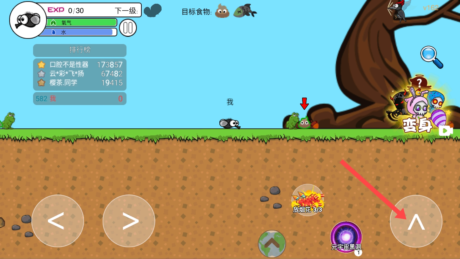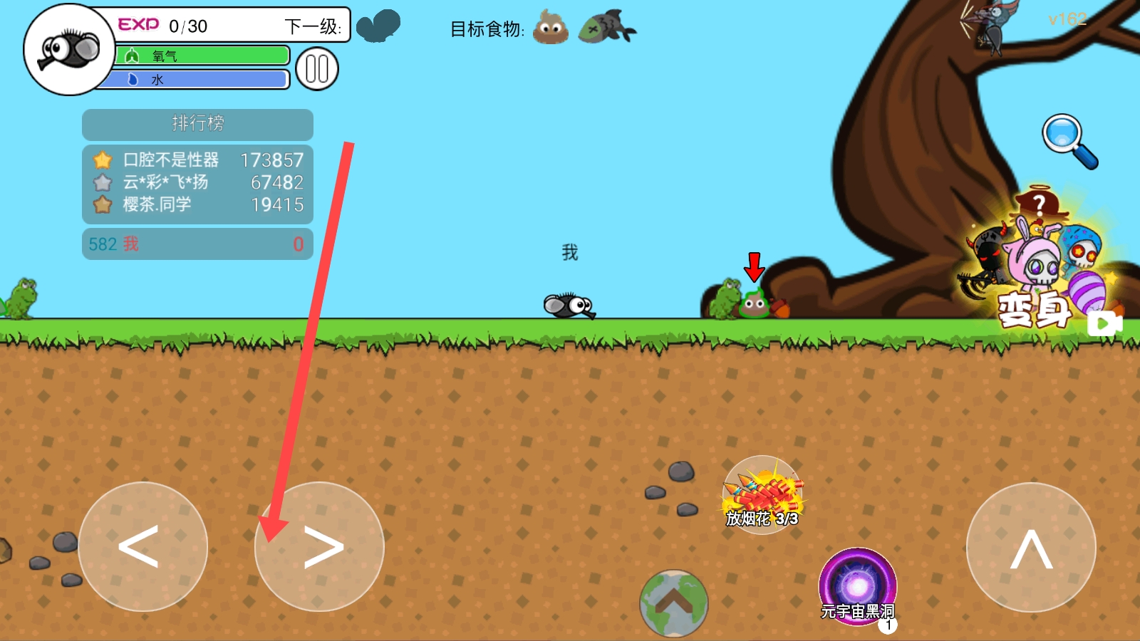 3、点击右侧的跳跃键(向上箭头 ),完成相关动作,获取经验值(EXP),朝着升级目标努力,同时注意氧气和水等状态条。