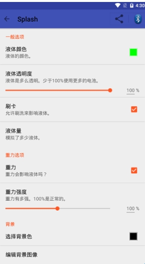 5、发现可以设置液体颜色、透明度、液体的量等液体选项,还有重力选项,最后是背景选项