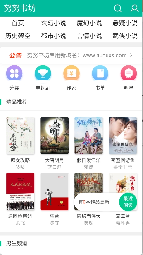 2、来到首页以后可以看到很多的小说资源类型,不管是言情、悬疑还是都市等类型都有。