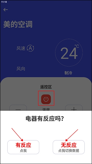 5、再点击“开关”按钮,系统会弹出电器有无反应提示,成功开启了就可以选择“有反应”,没成功就可以点击“无反应”来查看原因。