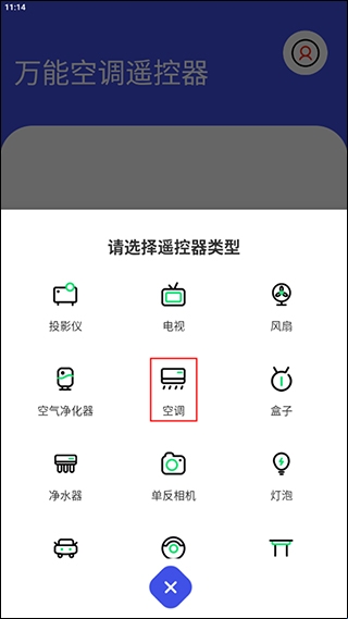 2、进入选择空调遥控器类型界面,找到“空调”按钮并点击进入。