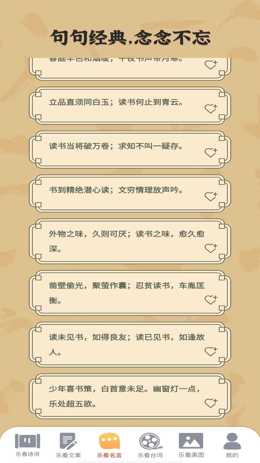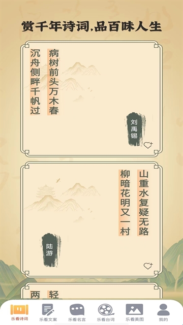 聚享乐看app是一款非常好用的诗词名言文案学习类软件,这款软件拥有丰富的文案学习资源,包含了电影台词,经典名言,诗词歌赋,朋友圈文案等多方面的内容,满足用户多样化的文案学习需求。软件的界面清新文艺,配色古典淡雅,带给用户视觉上的享受,喜欢文字阅读的朋友们快来下载体验吧。