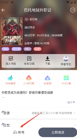 1、点开喜欢的小说进入到详情页,点击“听书”。