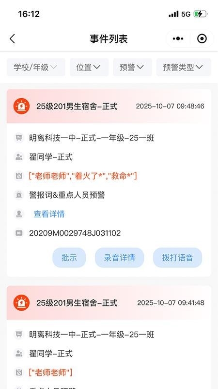 可同学校、年级、位置、预警类型等条件筛选事件,以便快速找到,便于查看详情。