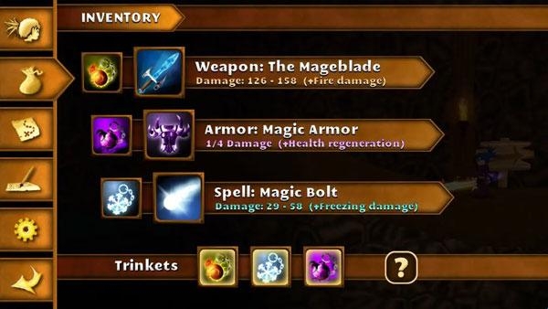 2、这是装备面板,由上到下分别为“武器”“盔甲”“法术”,下面为元素附魔,分别为焰之元素(附魔可以提升攻击,附魔至盔甲可以造成周围伤害),霜之元素(攻击可以造成怪物暂时行动缓慢,盔甲同上),魔之元素(这个我真搞不懂了,我把它附魔在盔甲上,一段时间可以回复血量)。