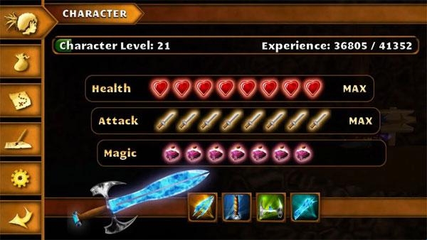1、这是人物属性面板,第一条是HP上限,第二条攻击力,第三条是MP上限。下方四个空格是传说之剑的碎片,游戏后期可以收集完全。