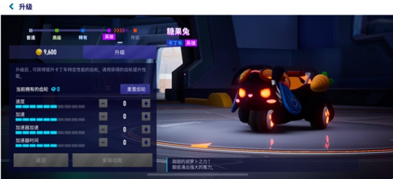 4、车辆分为5个等级,分别是普通、高级、稀有、英雄、传说,消耗游戏中的金币可以将车辆进行升级,每提升一个等级都会获得相应的齿轮,利用齿轮可以自主选择提升车辆的各种属性,就是类似天赋点的存在。