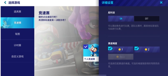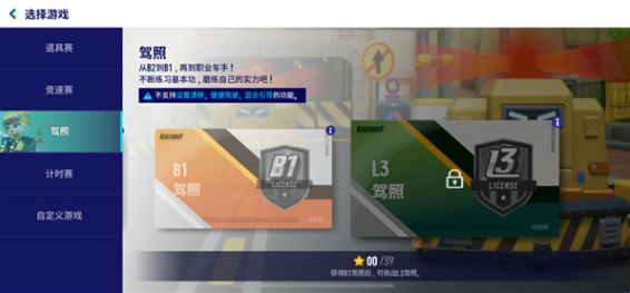 2、游戏的模式方面还是熟悉的道具赛、竞速赛、计时赛几个种类,道具赛中的道具自然也是熟悉的导弹、水炸弹、磁铁、香蕉皮等等。竞速赛需要考驾照,至少考到B2驾照才能参加。不过目前游戏中能考到最高等级的驾照只有L3,后续等级的驾照暂未进行开放。