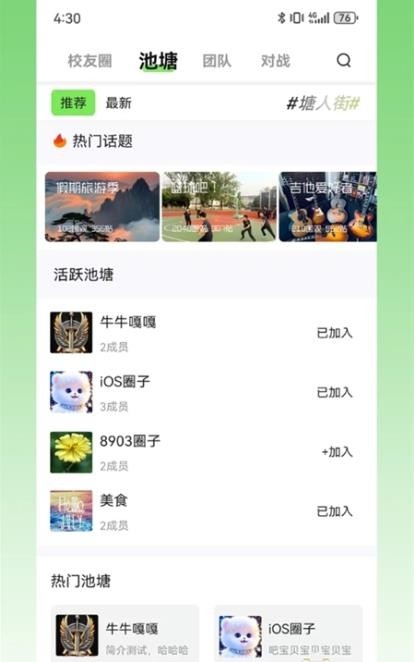 2、兴趣池塘:用户可以发起兴趣池塘,寻找校友、创建团队(线上结盟/线下对战)、参与赛事等,增强社交互动性和趣味性。