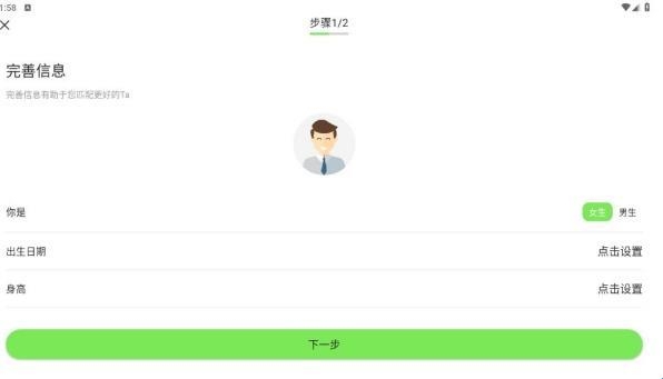 3、新用户需要完善个人信息,将身高、体重、年龄、星座、昵称等各类信息上传。