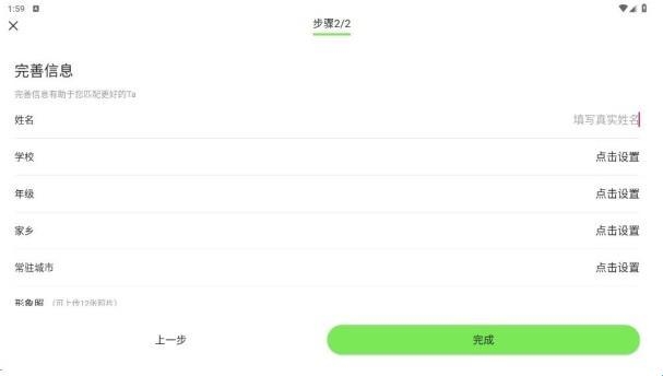 4、为了保证速配好友更适合,还需要确定我们的名字、家乡、毕业学校等基本情况。