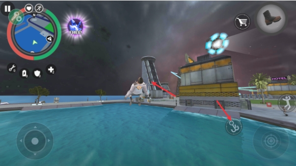 2、对准墙壁我们可以发射绳索,让你实现短暂的飞行。