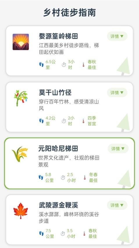 这里还提供了相关的乡村徒步指南,可以对徒步路线进行查看,领略乡村自然风光。