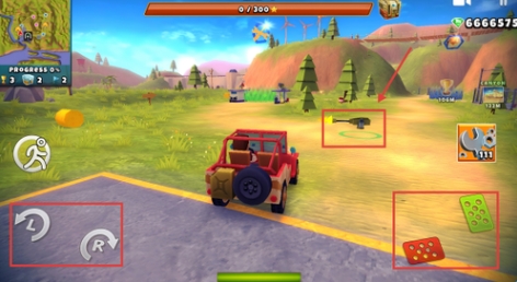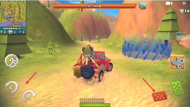 2、使用屏幕左侧的左右转向键控制方向,右侧油门与刹车配合操作,靠近武器道具时及时拾取以强化战力。