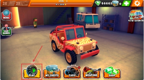 1、进入游戏主界面后点击车库中的PLAY按钮,选择初始车辆准备进入战场开始狩猎任务。